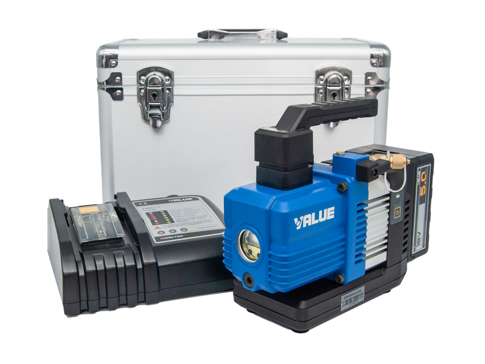 Pompă de vid monocelulară compactă fără fir proiectată pentru refrigeranți din grupele HFC și HFO (ex.: R32, 1234yf).